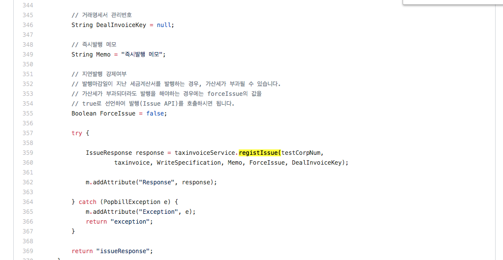 https://github.com/linkhub-sdk/popbill.example.springMVC아래 코드는 예제로 제공되는 세금계산서 신고 기능관련 코드이다. 세금계산서 클래스 멤버변수에 작성할 값을 넣고 함수호출만 해주면 끝난다.. 단순하다. (직접 구현한 코드는 보안상의 이유로 게시할 수 없어 예제코드를 대신한다)